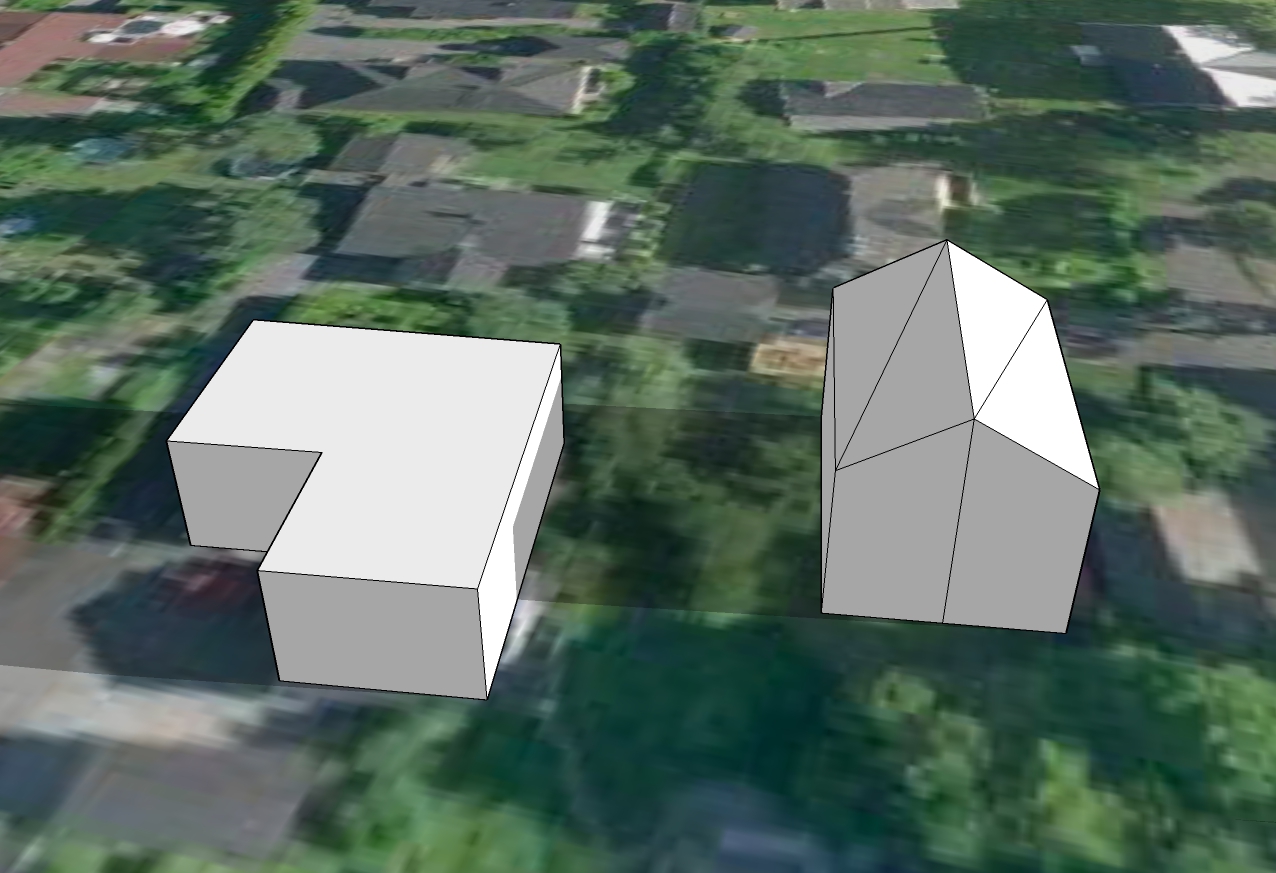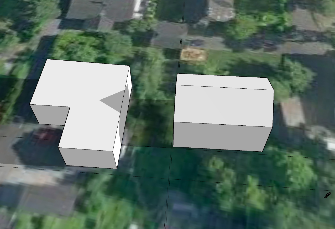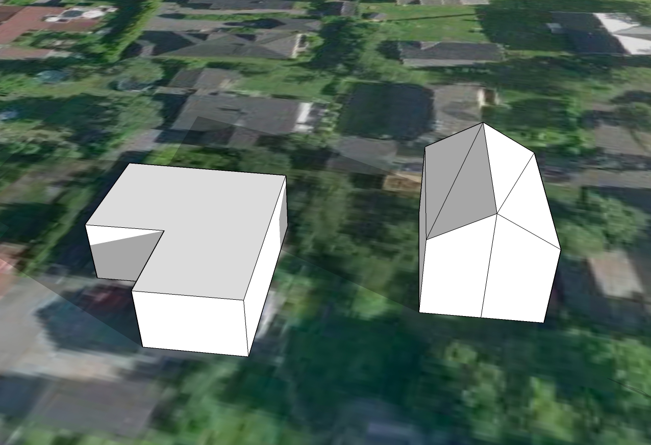 Derfor en forklaring isteden. Formen på huset vårt er veldig veldig forenklet. Vi har ikke flatt tak, slik at "taket" her er ca gesimghøyde. I tillegg er det jo en terrasse foran huset og dermed er husveggen egentlig litt over tre meter innenfor "veggen". Den korte delen er garasjen. Det hele er vesentlig bedre synlig i skyggevideoene, så at det har hele tiden vært mulig å tolke helheten riktig.